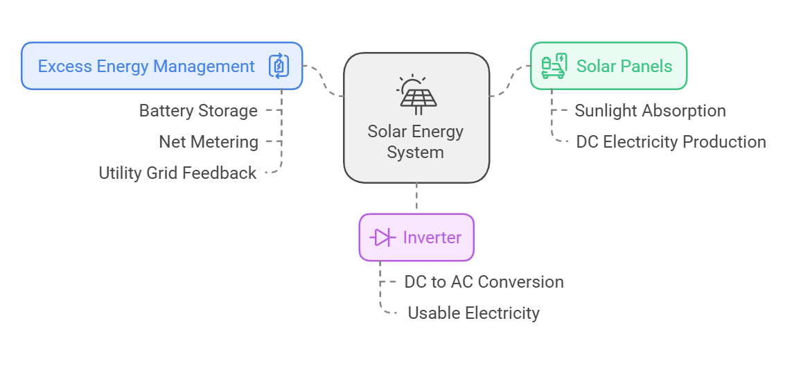 Solar energy is simply power from the sun. When sunlight hits solar panels, the panels absorb it and turn it into electricity. This electricity starts as direct current (DC), but since your home uses alternating current (AC), an inverter converts it into the type of electricity you can use for your appliances, lights, and more.
